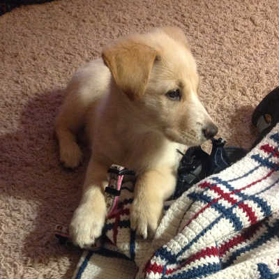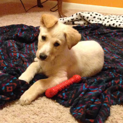 Kassidy is a 4-month-old female Golden Retriever mix. She and her brothers, Cisco 15-269 and Yancy 15-268, were orphaned when their mother was hit by a car. They were likely on their own for a while before being brought to the pound, but did not do well in that environment. A Good Samaritan brought them home and called RAGOM.