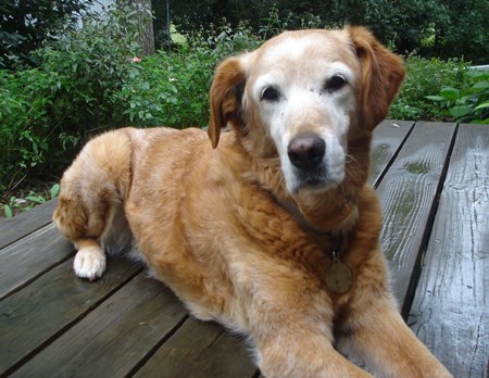 Please welcome Miss Katie to the RAGOM family. Katie is a ~ 15-year-old golden mix who was brought to a shelter as a stray. She had a check-up with our wonderful RAGOM vet Dr. M. and passed with flying colors for a gal of a certain age. Katie is spayed, up-to-date on her vaccinations, negative for fecal and heartworm tests, microchipped, and her bloodwork is perfect. As one would expect, she does have arthritis and her elbows are particularly sore. Katie also has a lump on her back, about midway between her neck and tail. Dr. M. said that the lump is bone due to overgrowth of a vertebra. We started her on an anti-inflammatory medication and she seems much more comfortable. Because of her arthritis, we are going to try and keep Katie at her current weight of about 50 lbs.