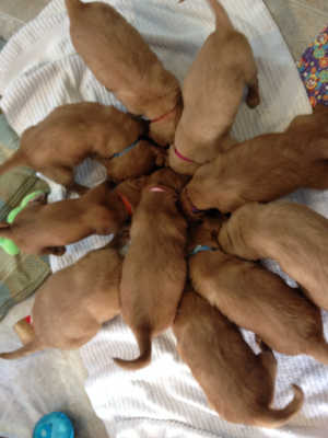Leo is our most blonde male. He is the second biggest guy from this litter. Leo loves to chase balls and chew on the soft puppy toys in the pen. He was the first to seek out his human family for cuddles. Leo is currently 6 weeks old and weighs 7 1/2 pounds. He has been dewormed, has been treated for coccidia and giardia, and has received his first set of shots.
