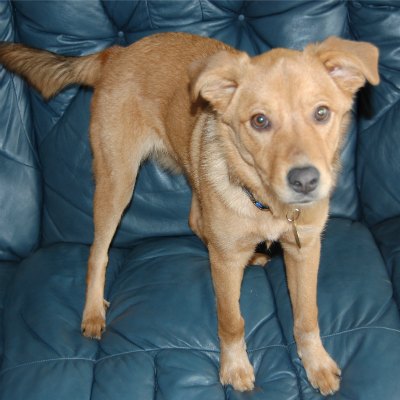 She is an adorable medium size mix only weighing 25 lbs right now. She has all of her adult teeth which would put her at 6 months old at least (she seems a little older than that). Lillie is just a sweet little peanut that will give you love and cuddle up with you all day long if she could! That is when she takes a break from playing with her toys, which provides entertainment for all. She can entertain herself throwing toys around and pouncing on them or she loves to play fetch with you.