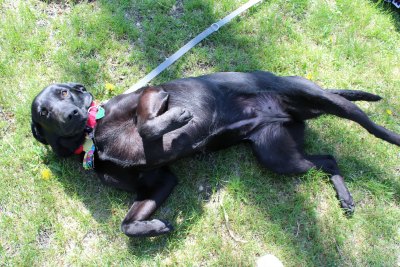 Lucille can get very excited at times, but also can relax. She pulls hard on a regular leash, so she is currently using a harness to help with that. She is not a fan of the gentle leader at this time and refused to walk with it. Lucille did fantastic with the thunderstorms we have had and in fact, gets excited when it is raining outside!