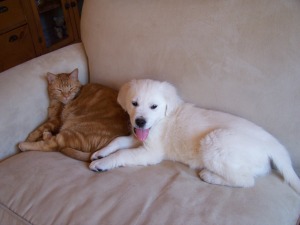 FM here again: Luke has gotten into our routine really well. I work from home and so I’m able to work with his potty training. He is doing well with that but it is still a work in progress. He now heads for the door as his cue when he has to go (such a good boy!!). He has spurts of activity where he’ll play hard and then is zonked out and naps. His favorite spots are a dog bed next to me or in the kitchen on the cool tile floor. Sometimes I crate him to reinforce that it is “down time.” He did NOT like being crated when he first got here, but he is getting more used to that. He sleeps in a crate at night and he loves having his own cozy nest. He is not too crazy about being crated during the day though, and he will bark for the first few minutes before he settles down. He’s been in the crate during the day for up to 3 hrs while I get some work done or am away from home.