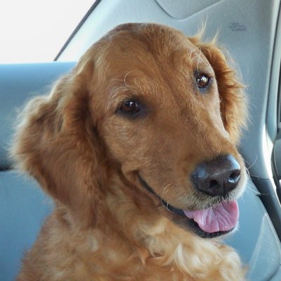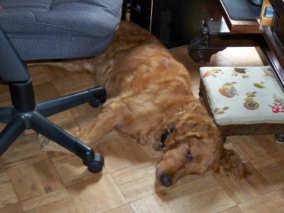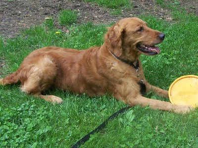 Maisy weighs 65 lbs and has a short wavy dark red coat with cute curlicue ears. She has the most expressive face I have ever seen in a dog—you can look at her and see just where she is at. When she first got here she had deep worry lines in her forehead. I massaged her forehead and sinuses, and watched as her face relaxed and the lines melted away with each passing day. She has a beautiful big snout. I suspect she has an incredibly developed sense of smell. She sure likes to take a leisurely walk out here in the country and smell everything she comes across!