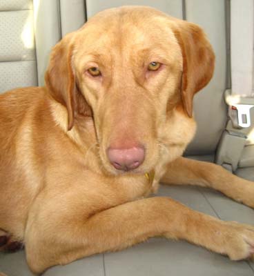 The vet believes she is about 1.5-2 years old and is in good health besides being a little starved for food. She is about 44 lbs and is fine boned with a beautiful reddish/gold, silky, short coat, a flesh-colored nose and hazel eyes.