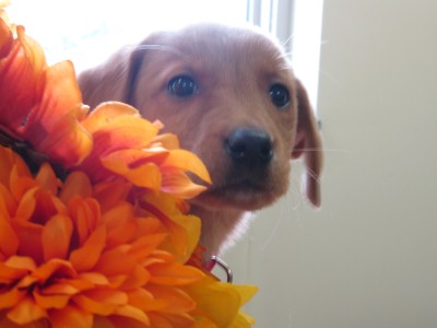 Hi It's me Moxie girl. I just arrived to Ragom Land yesterday with all my sisters. I'm in foster care with two goldens. They are very nice to me. They are really, really big compared to little 6 pound me. I'm about 71/2 weeks old. Golden/Lab mix with white touches on my paws. I didn't like being crated at bedtime but I went to sleep. Then about 1am I decided to test my lungs out to see if they worked and they did. I went potty, was put back to bed and decided to practice my singing for 45 minutes. Then I tired myself out and went back to sleep.