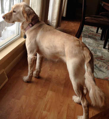 Here is some other information about Nala that may interest you: She is cat-friendly and kid-friendly and does not require a fence. She comes to her name, walks well on a leash, plays ball by herself, and plays well with other dogs. She frequently crosses her front paws when laying down and loves to give kisses. She sits for treats and takes them gently with her mouth. She has a quiet and sensitive personality. Her fur is thin and super soft; we don't think she is shaven, but it is hard to say for sure -- her ears and tail have long fur and torso has short fur. She always wants to be in the same room as you, but keeps to herself, unless you ask for attention, then she is right there. She is crate-trained and toilet-trained. If given enough exercise, she does not chew; if fed a high-quality dog food, she does not counter surf in the kitchen. If she is to be an only dog, she will need a family that is home a lot.