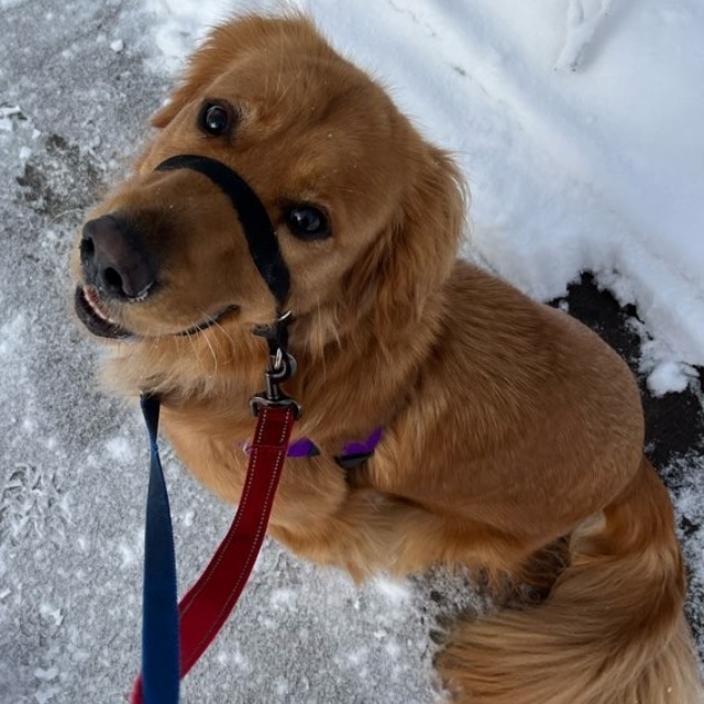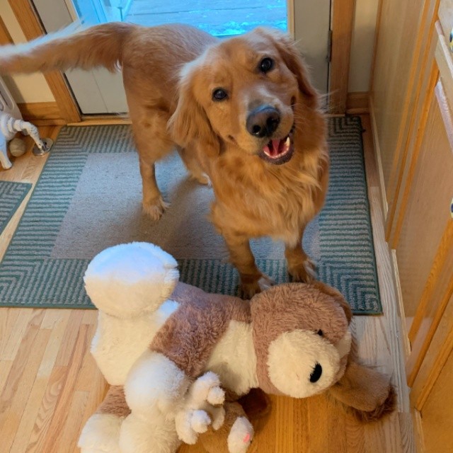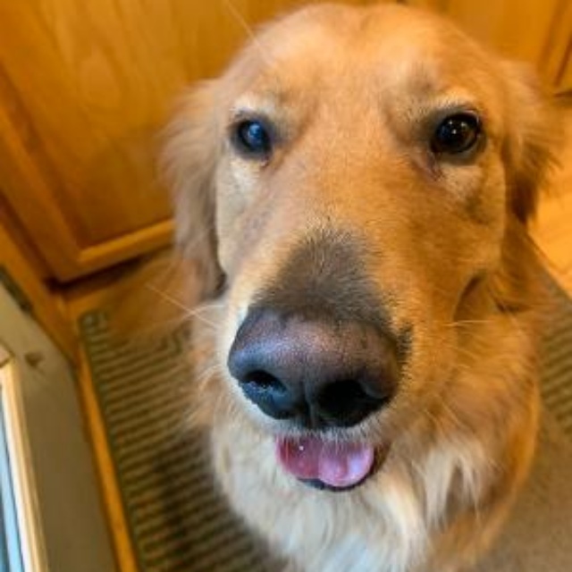 Nuke traveled all the way from China via Canada before arriving in Minnesota! Sadly, we believe Nuke was abused before coming into RAGOM, and as a result, this guy is understandably cautious in certain situations. Nuke has been with the same loving foster family since he arrived and is a devoted family dog. He has been working with a trainer to learn how to accept his surroundings and ultimately enjoy his golden life. His fosters have taught Nuke how to walk on a leash, enjoy his baby pool, and the company of people, and now he is learning how to trust people.