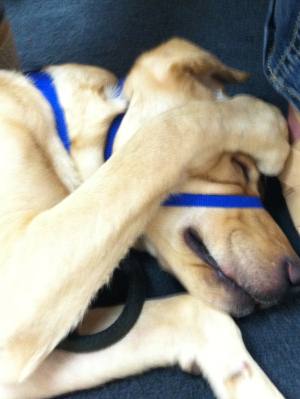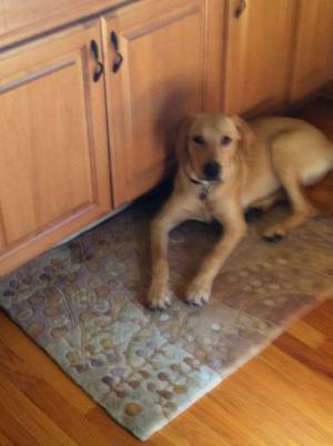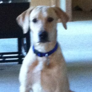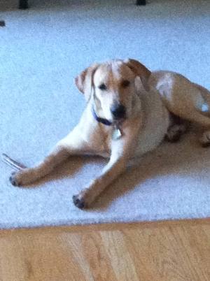 The first night was rough as he didn't want to be in a kennel, needless to say. I laid next to his kennel for hours talking to him softly until he finally fell asleep. The next day I kept him very busy with training, walking, meet and greets at Caribou, and then finally to the vet. Everyone loved him! The vet couldn't believe he was ever considered to have kennel cough, let alone slated to be euthanized! He said he is a very lucky, healthy, 51lb, approximately 6mos old handsome yellow lab. He is the most lovable, adorable, and smart dog. He has learned so much in this very short time. I took him with me for a jog yesterday and he had learned to keep pace and not tug on his lead within a half mile. Incredibly smart with words and routines.