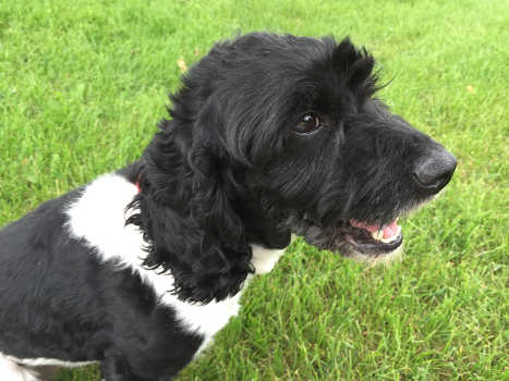 Hello, dear people out in RAGOM-land. I have the pleasure and honor of introducing you to Pippin, a 3-and-½-year-old male being fostered in Andover, MN, who may be the sweetest little addition to RAGOM ever. He’s not a typical RAGOM foster dog, because his size is different (he’s only about 20 pounds), his color is different (black and white), and his fur is different (he doesn’t shed, but he does need regular haircuts and grooming). Nevertheless, he’s a RAGOM dog because he needs a home where he will be loved and treasured for the rest of his life. He came in with some other dogs that were Golden Retriever-types, so I think it was part of a package deal, but it’s all to our gain: Pippin is a wonderful dog that I am proud to foster, and who deserves the Golden Life. He will make a lucky family incredibly happy, as soon as we find the right match for him.