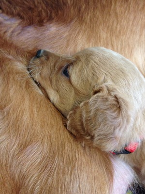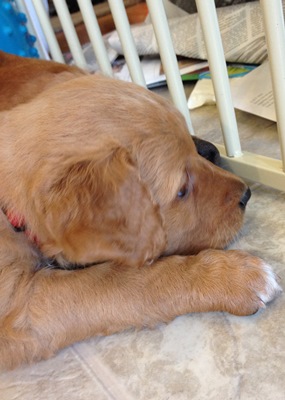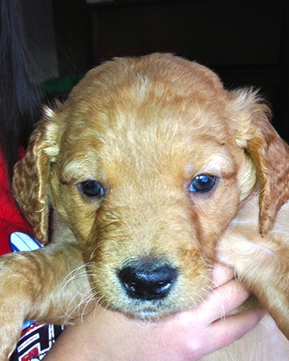 Poppy is one of 10 puppies from Alli 13-353 who came in from a breeder that retired due to health issues. Poppy was born October 29, 2013. She is a very healthy, active puppy learning all about life. Poppy enjoys playing with our five children; she has a good start on being well socialized. Poppy is our girl with the curls! She is a true sweetheart and loves to cuddle and fall asleep in our arms. She has cute little white toes.