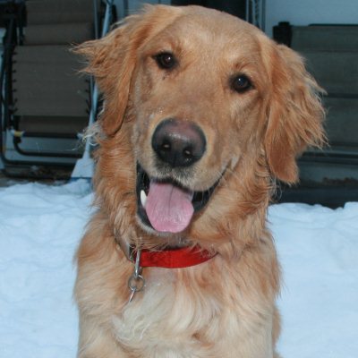 He was certified by the breeder to have no issues with hips and eyes. Ronnie is AKC registered and his AKC name is Rocket Ronnie. Hmmmm..... how fitting. He is up to date on all shots and is neutered. He weighs 65# so a typical size for a golden. He is a dark blond in color. He has beautiful feathering and wavy air on his ears.