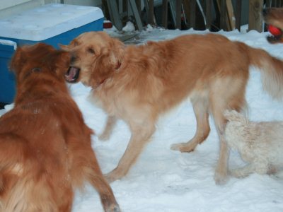 He does not do any resource guarding of food or toys. He likes to play tug-a-war with resident golden Max. He sometimes gets carried away with Duster a 10 lb poodle mix. He should be watched that he does not hurt little dogs unintentionally. It is unknown how he would do with cats.