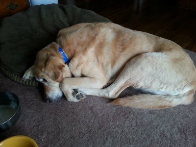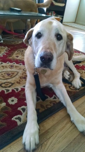 Please welcome sweet Sadie into the RAGOM family. She is a golden/yellow lab mix and is approximately 9 years old. Sadie was a beloved member of her surrendering family for many years. However, Sadie has had a rough couple of years as the health of her owners declined, and they have not been able to give her as much time as they once did. All that has changed for her now! She is a lucky RAGOM girl.