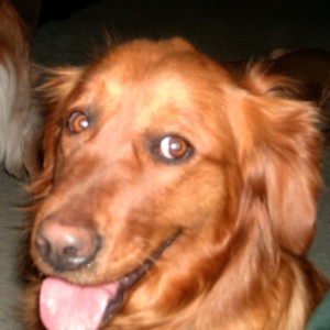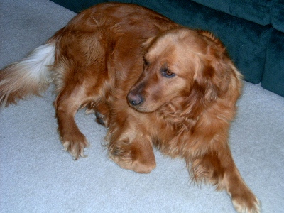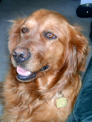 I'm just getting to know Sadie Rose and she is quiet, shy, and somewhat submissive but she is warming up to everyone. So far, she likes her fur butt foster sister Sophie, who is another RAGOM girl (Cowgirl), because Sophie is quiet too. I also have Liam 08-590 visiting this weekend and Sadie Rose doesn't quite know what to make of him yet. She thinks she would like to play with him but isn't sure. Must be his whiskers! She was living outdoors so I don't know if she is housetrained but thus far we haven't had any accidents. She walks wonderfully on the leash - almost walks at a heel without being commanded. If you stop walking, she immediately returns to your side if she has been off investigating something and sits. She doesn't jump up on you. If you sit down, she will immediately come up and sit to be petted. She fell in love with my son and he really likes her too. She kenneled up last night and slept all night without a peep until our friend, Liam decided to wake everyone up at 5:30 this morning. (I call him "BratBoy.") I tried to include a couple photos of her but they don't really do her justice. She is a beautiful reddish golden color. I will keep trying to get a good photo but good buddy Liam always wants to get in the way!