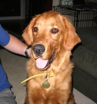 5/26/06: Sandy is a 6 month old, beautiful red Golden girl who weighs around 50 pounds. She made a really big trip from the middle of North Dakota to the Twin Cities yesterday and now she is settling in quite nicely. She gets along well with both of our dogs and is gentle with the cats. She does, however, wonder why our cats are so grouchy when she's just trying to say "hello!"? She also lived with kids in her previous home.