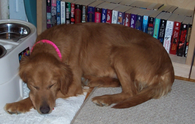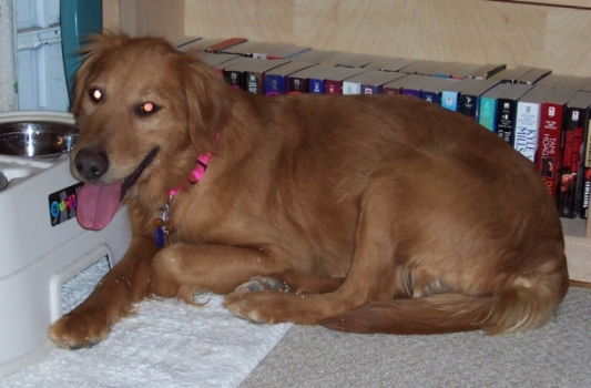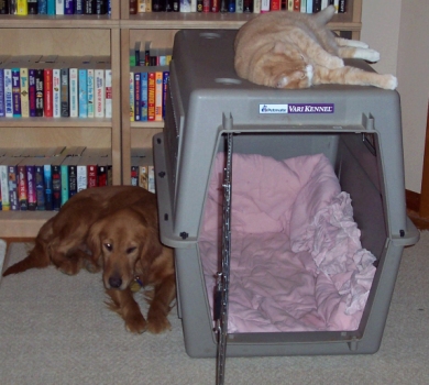 Shawnee started her day yesterday in Kansas, and ended up in Moline, thanks to multiple transport volunteers. It took a little bit of time to coax her out of her crate, but she jumped down on her own, and walked into the house pretty easily. She's staked out a corner of my office as her "safe place", and runs and lays down there whenever she's nervous. She's met the cats from a distance - she's pretty scared of them. My large yellow cat, Sundance, purrs really loud, and I think she thinks he's growling at her. Whenever Sundance walks near her, she runs to her corner, or into her crate. She's also fascinated and scared of the TV. She'll watch it, but as soon as something moves fast, or is loud, she runs into her corner.