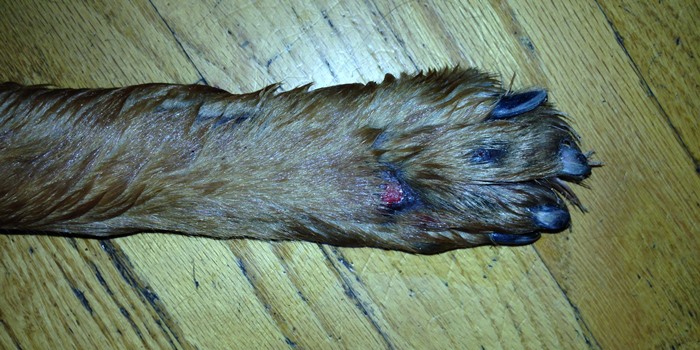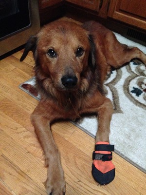 Silver is approximately 3 years old & is a golden mix. He weights in at 44 pounds & could gain a little weight. He was also heart worm positive & has old injuries to his left front & right rear paws. When he first arrived it looked like maybe he was shot through the paw since there was a healing round hole on the top but after visiting the vet we found out that was not the case. The best guess is that he was hit by a car at some point & has suffered subsequent nerve damage to his front leg & is therefore unable to bend it at the elbow. This causes him to swing his leg out to the side as he walks, or drag the leg forward with the top of the paw scraping the ground. As he walks over hard surfaces it then gives him an abrasion on the top of his paw & thus what looked like a possible gunshot wound. On his back paw he has a couple of toes that are missing & the vet isn't sure if the 2 injuries are related or if he was born that way. We have been having Silver wear a doggie boot on his front leg to help protect his paw from further injury. Most of the surfaces in our house are either hardwood or tile so he wears it pretty much all the time....he leaves it alone & certainly doesn't seem to mind.