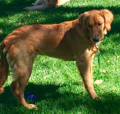 Skye is house trained and sleeps through the night. She loves to play and go for walks. She knows several commands, but would do well with an obedience class. She is crate trained and does fine when in it, but would definitely prefer not to be locked up. She does not have any separation or storm anxieties. We do crate her when we are gone, but usually only for 3-4 hours. Skye has been around a small child without any problems. She was very timid around other dogs and people when we first got, her but she has definitely come out of her shell and has become a social Golden with the help of our older dog. Skye came to RAGOM because her former owners decided they were no longer up to breaking in a puppy. They were used to an older, calmer Golden that had sadly passed away.