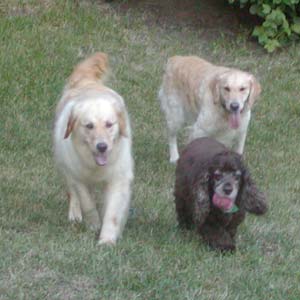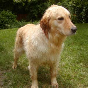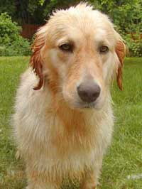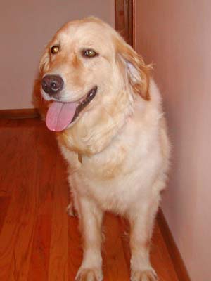 Tess came to RAGOM from a breeder in Missouri. She was born sometime in 2002, so she is approximately 6 years of age. She has a very soft and silky coat with some interesting red and blonde high-lites. The uncanny thing is she has the same color and markings as my Indy (Jacinda 07-253) who also is a former Missouri puppy mill girl. The big difference is that Indy has a very curly/wavy coat and Tess has a very soft and straight coat. My guess is she is around 75 pounds or so. We will find out for sure on Tuesday afternoon at her vet appointment.