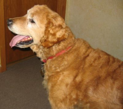11/23/06: Sport is an UTD, 8 year old, neutered purebred Golden. I was surprised at our first meeting - Sport is a gentle giant at 92 pounds. He is very gentle and sweet. He spent the first part of his life as an outside dog on a farm. He has been a gentleman here without any accidents and paces by the door when he wants to go out. We spent some time brushing his wavy coat and he loved the brushing. Sport does urgently need vet care and will be going into the clinic first thing Friday am. He has a mass above his right eye that was first noticed two weeks ago and needs to be treated. The mass is growing very fast and our hope is that it is an abscess or something similar that is easily treated. Sport made friends with our resident Golden and has been only mildly curious about our cats. We will update as soon as we find out more about the lump/mass above his right eye.