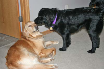 Surri still has a puppy personality and tries to play with our resident GR Mia, but Mia feels the need to let her know who is boss….little stinker. Surri doesn’t care though; she just keeps trying to play! Yesterday she played with a male lab/rott mix and they had a blast – he did not feel the need to let her know who is boss :)