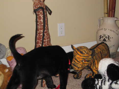 She is eating well. And is ignoring all of the "puppy" toys in favor of full-size bones and stuffed toys. She took down her first moose this past Sunday, and is facing off with the tiger and other jungle animals. Smart cookie - she has already figured out sitting (and looking cute) to get a treat.