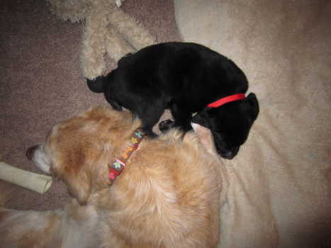 Suzie alternates between thinking the resident Golden is her momma or her chew toy. So funny to watch the little one following my adult female around and trying to imitate her. The other evening, they were outside to go to the bathroom, and as soon as my female golden squatted, the puppy squatted right next to her.