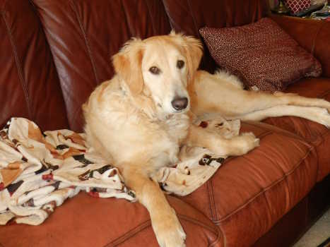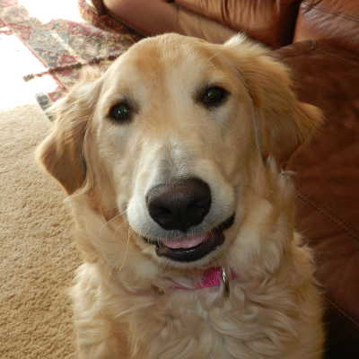 Welcome back Tanner, now known as Monty, a 9-month-old purebred Golden. This pup was part of the group from the Missouri auction in August. He was adopted last fall and has been growing up over the last few months. He weighs 65 lbs. and is a beautiful light-colored Golden. He has gotten obedience training and knows "sit," "come," "down," and other basic commands. He walks nicely on a leash. He has been trained to walk on a treadmill, but I haven’t tried that out. Our weather has been so nice for February that we are walking 2+ miles and letting Monty become part of our pack. He is kennel trained and sleeps there. He takes treats nicely. He sits and offers his paw. He rarely barks, but will whine if he needs to go out and bark to come back in. He is housebroken and will pee and poop when you tell him to outside. For a young dog, he is well-trained and well on his way to being a great dog. Monty just needs someone patient and consistent to finish his training and might do well with a playful, confident dog to help burn off that puppy energy, or else long walks.
