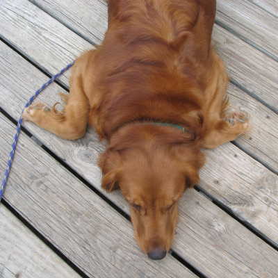 Tess had her wellness check at the vet and was found to be very healthy with the exception of a bilateral ear infection (which has now cleared up). Dr. H. did recommend that she lose some weight since she weighed in at 80 pounds. The picture of Tess standing is to show that she actually carries her weight quite well--she is very quick and fast in her movements. She was heartworm and parasite free but needs a booster shot in a few weeks and her spay operation. Since she is so skittish, she is hard to lead because she immediately lays flat on the ground when you try to lead her, so I've waited with her spay operation, hoping that with a little time we might be able to lead her better so she doesn't scrape her belly on the ground. When Tess is ready to come in from outside, she flops down on her belly and turns her front feet in a most unusual way, sort of splayed out to each side.