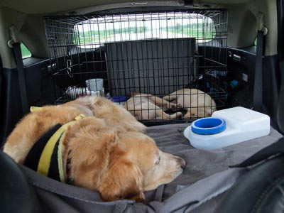 Willing to risk that her car might become a “rolling flea circus” Devon and her resident, Chaz, picked up the pups and started the long journey north. Each stop along the way was documented and production values – pee and poop – were carefully observed. They visited OK and KS, and even met some new friends along the way before it was time to stop for the night. Because the hotel only allowed two pets per room, Clem snuck in inside a duffle bag! By midnight, thanks to the barking and unpredictable squat-and-pees, they were in danger of being invited to leave, but managed to make it through! After a restful (?) night and sincere apologies to the staff and fellow travelers, they were off to Iowa and their foster home.