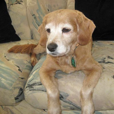 Meet Miss Trixie 11-205. She is what could be properly described as a small (toy) Retriever. She was found as a stray having to fend for herself during the flooding in Sioux City, IA. She was given the birth date of June 13, 2004 because she was estimated by a RAGOM Vet and staff to be 7 years old. She is a Golden Retriever/Cocker mix who is 26.5 lbs. and very petite. She measures from her head to the floor, 20”, from her back to the floor, 17”, and is 24” from her nose to her butt. She has the ears, legs, feet and tail of a Golden Retriever and a Cocker face and eyes. She is a medium golden color with a beige/white face and a beige/white freckled underside like the colors of a party Cocker.