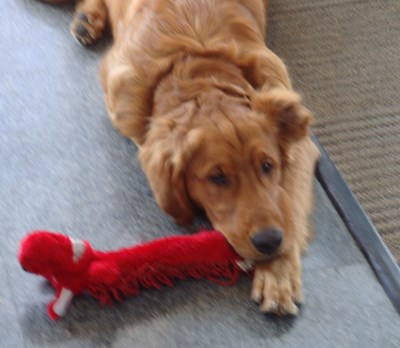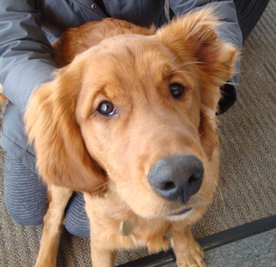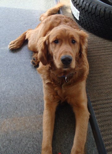 Vinnie, a purebred Golden, comes to RAGOM from a couple who loved him but he was just too much puppy for them. I had a large party at my home on my second day with him and he worked the crowd very well. He got almost everyone to pet him or play with him. I have had him five days and he has barked two times, both when he and I were playing. He does not guard his toys, food, or treats. He was a little shy at first but after a day he is fine. He walks well on a leash, loves to play, and loves car rides. One thing about him, he is missing half his left ear. You would not know it if I did not tell you. It looks like he has one ear perked up.