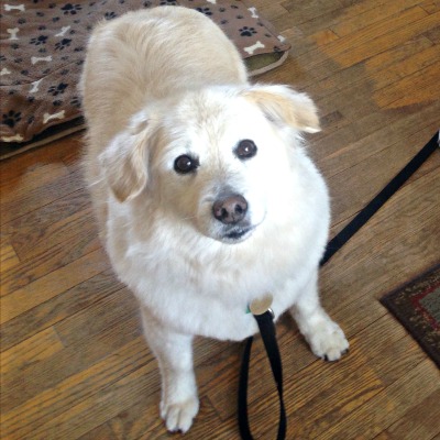 Meet Wilson, the petite golden mix who doesn’t know he’s 13 years old! We’ve discovered so many positives about this guy. He loves to go for a walk or ride in the car and is always ready for either one. I walk him with a flat collar and he sets a good pace. We’ve only been walking ½-1 mile. I think he can do more. He loves to be outside and isn’t bothered by the snow and cold. An excellent car passenger, he sits in the back seat and looks out the window and jumps in and out of the car on his own. Wilson goes up and down stairs without problem. Meeting the two smallish dogs next door at the 4-foot chain link fence is fun, he says. Our small resident dog (RD) and Wilson get along just fine and will share a dog bed. Wilson respects her signals that she doesn’t play. Wilson knows sit (he sits quickly), shake and down and takes treats gently. No inappropriate chewing or counter surfing. He’s taken a Kleenex out of a small wastebasket and dropped it when asked: solution – wastebasket no longer in reach. He follows me room to room and will lie nearby until we move elsewhere. In the morning, if he wakes up before I’m ready he puts his chin on my bed, and then goes back to his bed with a sigh and waits. Wilson got a clean bill of health from the vet, except for a mild-moderate elevation of one liver enzyme. The vet says this is non-specific and often seen in older dogs, no further testing needed. His other liver enzymes, kidney function and the rest of his blood work were all normal. Wilson takes no medications. He’s not shown interest in any toys or balls.